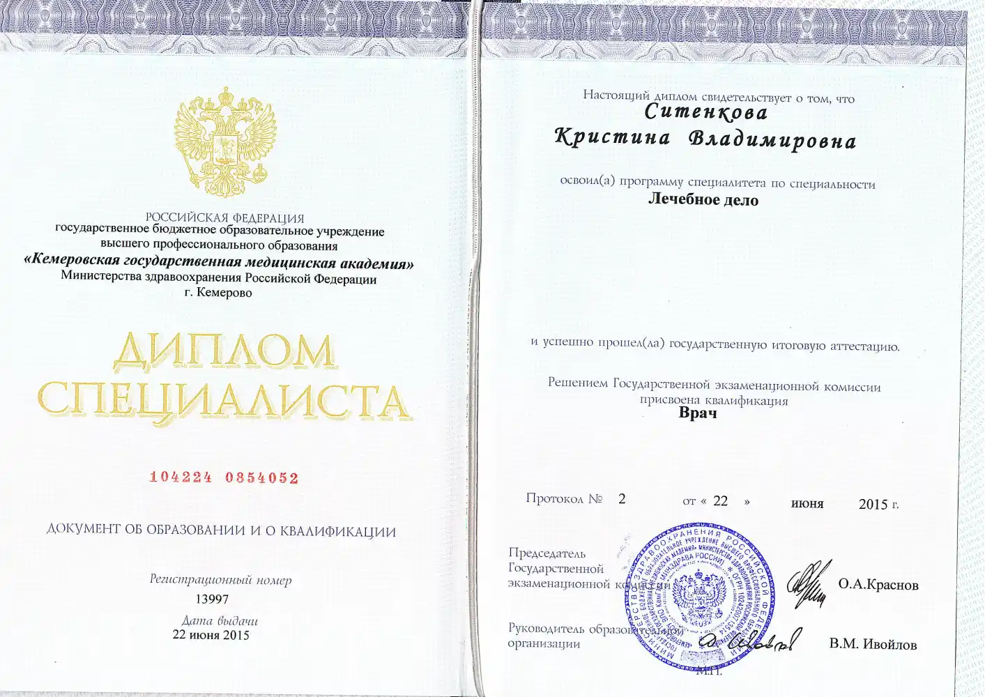 - 2015 — Кемеровская государственная медицинская академия (квалификация по направлению "Лечебное дело": врач);