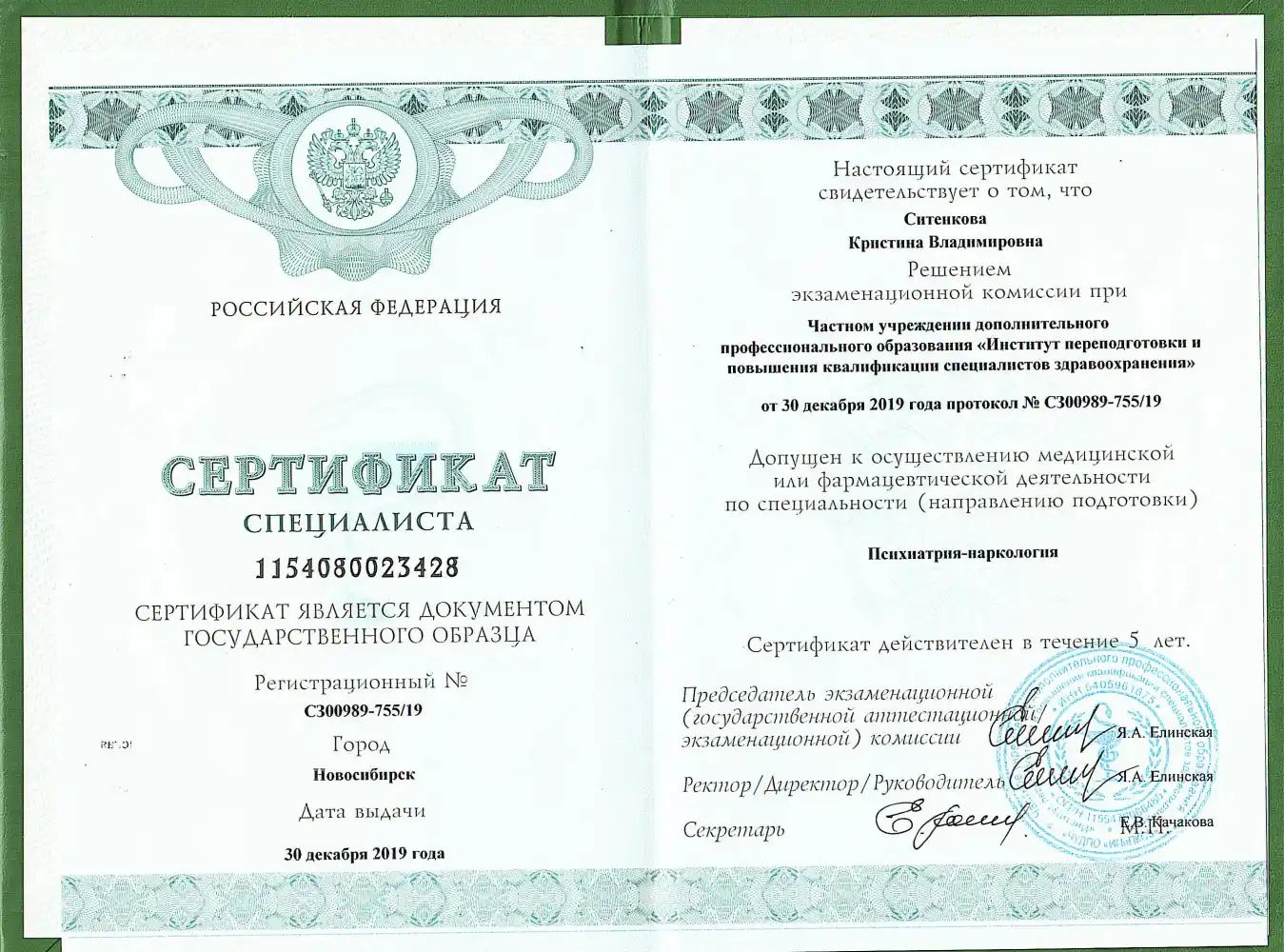 - 2020 — Сибирский институт непрерывного медицинского образования (специальность: Психиатрия).
